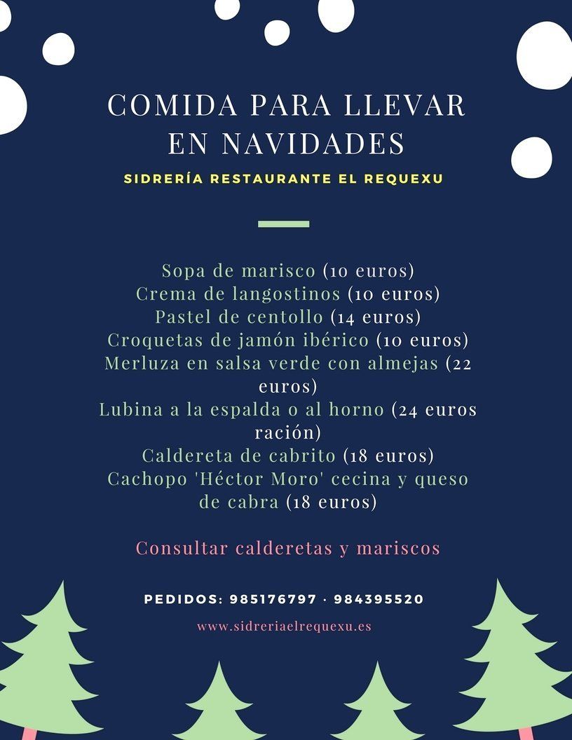 En la Sidrería Restaurante El Requexu volvemos a ofreceros un año más la posibilidad de llevar nuestros platos a vuestros domicilios. Consulta en el cartel la selección que os proponemos estas navidades.